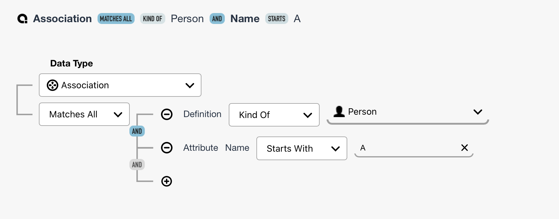 When the Data Type is set to Association (the default), the Query Editor will automatically add the first criterion, set to Definition. This is since an association always requires a definition.