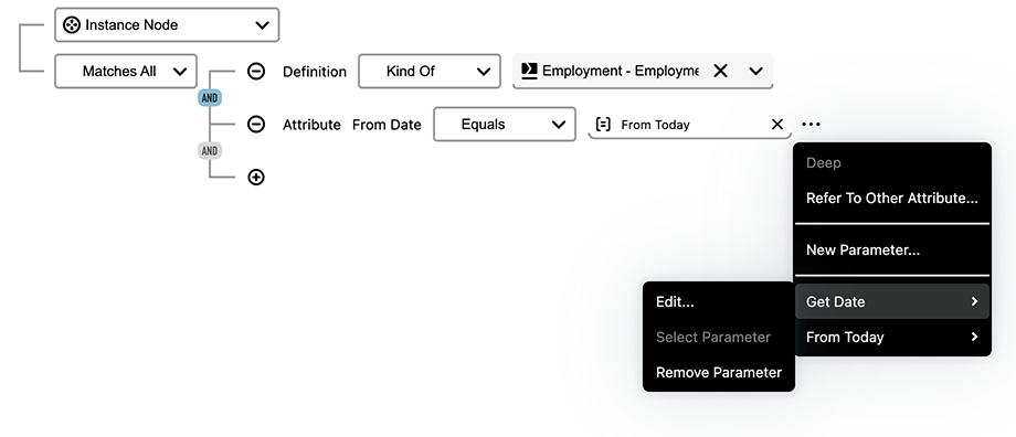 Add parameters through the menu that appears at the end of the criterion. Press the […] icon that is revealed when hovering over the criterion, and select New Parameter…