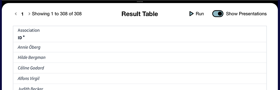By Default the result table will display the ID of the matching items, to see the presentation string, simply toggle the Show Prestentations on.