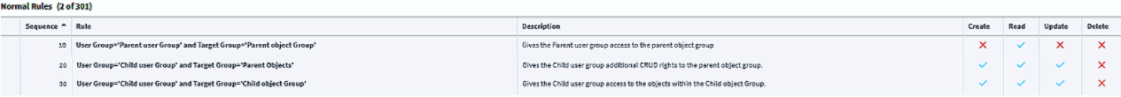 We have two user groups: aParent group and a Child group**.** The Parent group has a rule in the Normal rule level with a sequence number of 10. The rule connects the Parent group to an Object group, containing objects which every member of the Parent group should have read-only access to. Because this rule is targeting the Parent group, the Child group inherits the same rule. However the Child group needs to have additional permissions to both the objects it inherits from the Parent group and another Object group, containing an additional set of objects that only the child group should have access to.