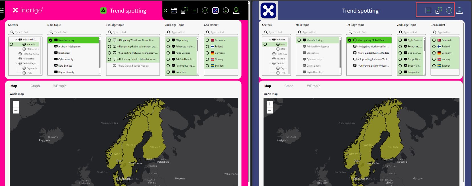 NOTE: This is the first step towards aligning more of the Theme colors. The implementation is of a more technical nature. Only some of the header Icons are aligned. You will still have to change the color themes in the Portal manually via the /admin part. Below is an example of the workbench theming and Portal. Also note that you will still be able to have different active themes in the Workbench and Portal.