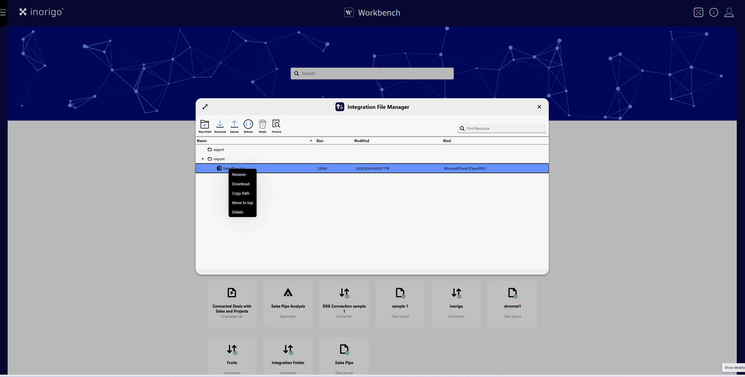 The Integration File Manager allows users to access, upload, download, and preview various file types directly within inorigo®, supporting more efficient data management and file handling.